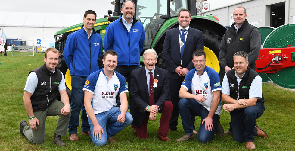 Photo caption: Sam Graham from Killinchy YFC and Matthew Cleland from Spa YFC on winning first place for County Down in the Machinery Handling Competition at Balmoral Show 2021(People in photograph L-R sponsor Johnston Gilpin Ltd, CAFRE - William Richmond and Selwyn Graham, Ian Harvey MBE, YFCU President Peter Alexander, Sponsor Johnston Gilpin Ltd and John Deere Representative)